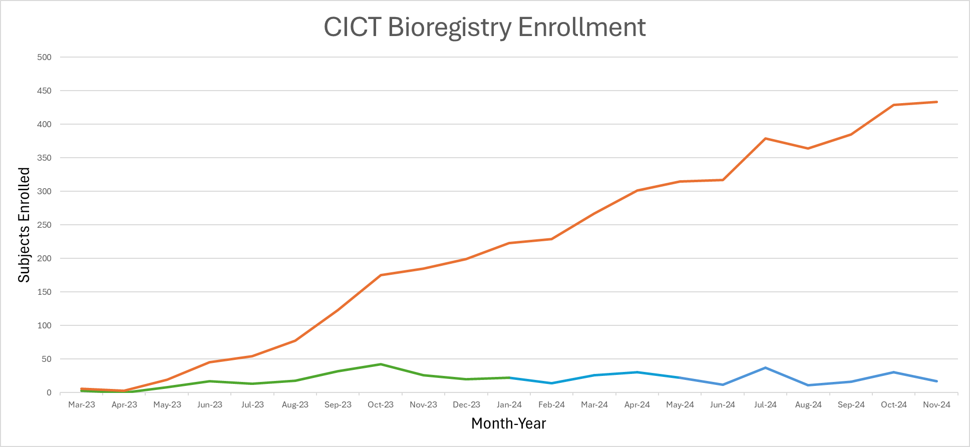 The CICT Bioregistry continues to grow steadily, recruiting an average of 20 subjects monthly. Since inception in March 2023, over 415 subjects have been enrolled in the CICT Bioregistry. We continue to enroll patients at the Cancer and Organ Transplant Clinic (COTC), as well as pre- and post-kidney transplant patients at UWMC. In the near future, we anticipate other organ transplant and cancer teams uploading data to further increase the size and diversity of the Bioregistry. Our Bioregistry is available for data requests with intent to serve the national and global transplant communities.